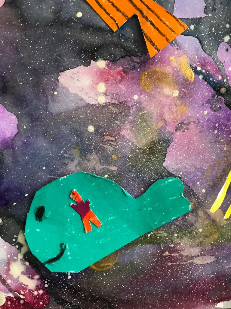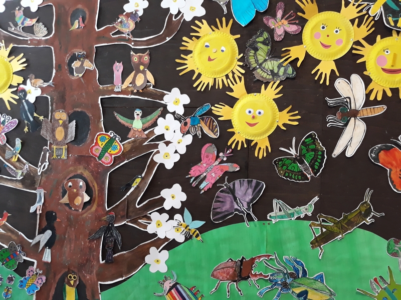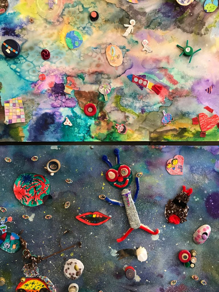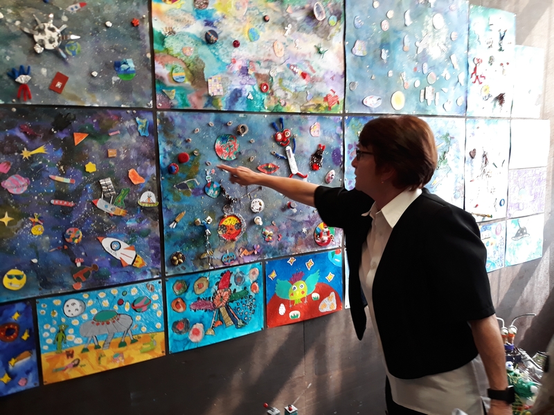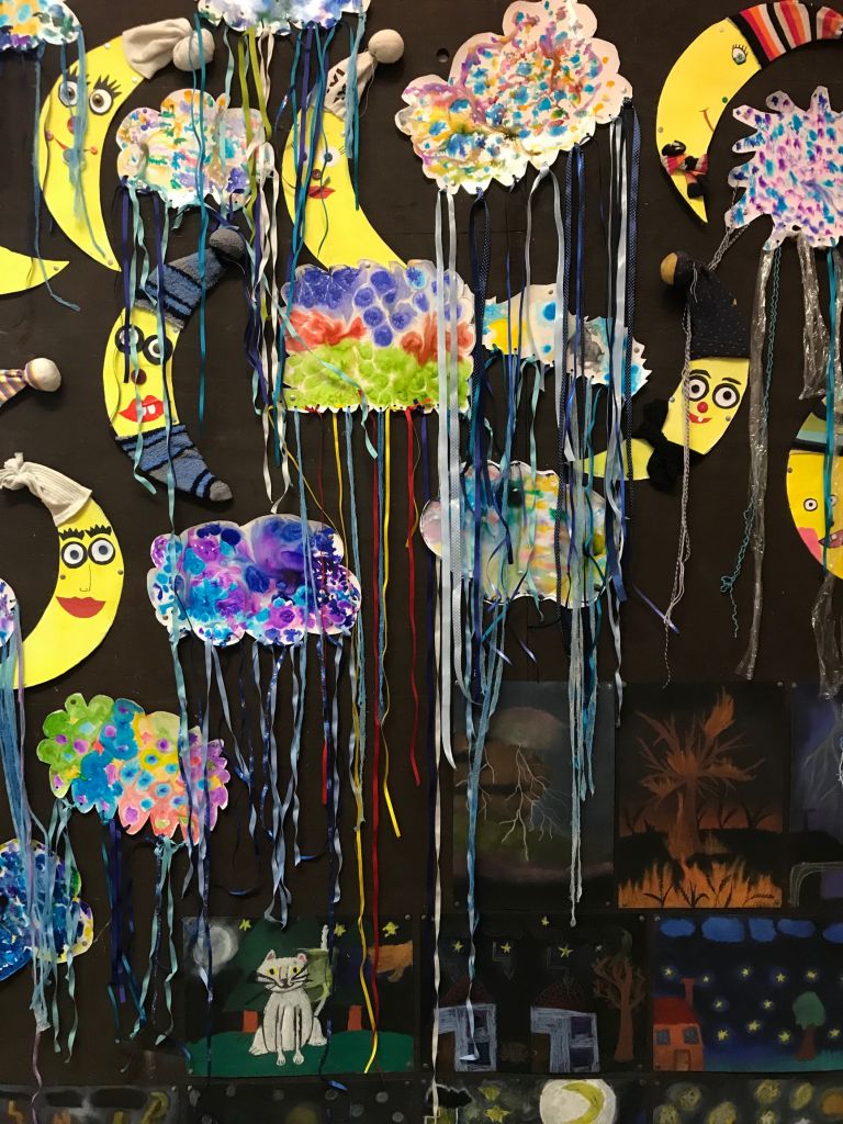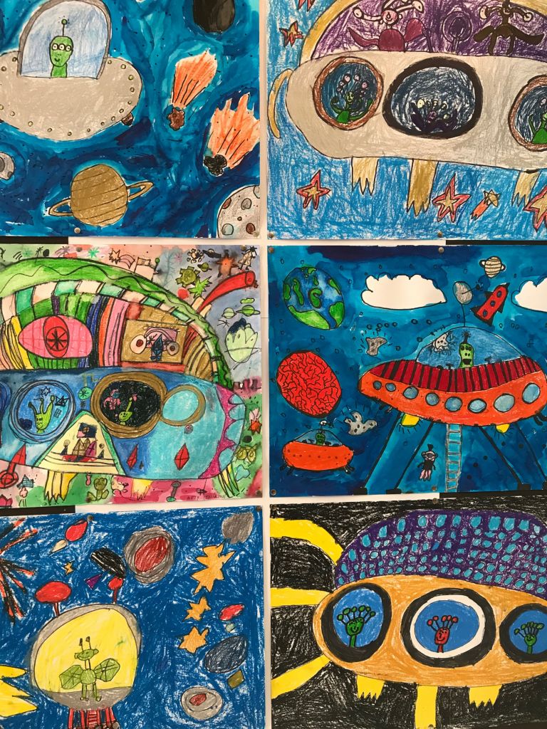 Jde o práce zhruba devadesáti dětí ve věku od 6 do 19 let z oddělení Vlasty Jiravové. Témata se volně prolínají od toho, co je dětem blízké, až po velké neznámo a tajuplno. Jedná se o práce plošné - kresba tužkou, fixem, rudkou, malba pastely suchými, olejovými a rozmývacími, ale i malba temperou a akrylovými barvami. V hodinách děti využívaly i netradiční materiály - papírové ruličky, kartony, různé druhy papírů, ale i různá plastová víčka a další obalové materiály (krabičky, apod.), kterým vdechly nový život tím, že z nich vytvořily něco nového spojováním, lepením a dalším dotvářením dle fantazie. Hravou formou tak vznikaly originální tvorové a objekty. V hodinách si děti vyzkoušely i různé experimentální metody - zapouštění barev, stříkání barev na velkou plochu - moře, obloha, malbu kuličkami a temperou. Obrázek pak vypadal jako zajímavá mapa - vesmírná louka. A když už se dotkly vesmíru, vytvářely nové a nové planety, které by se mohly skrývat za černou dírou. A když pozorovaly oblohu, vznikla nutnost vyrobit dalekohled a také namalovat temperou vše, co je v něm vidět. Olejovými pastely a kolorovanými kresbami nejmladší děti zachytily návštěvníky z vesmíru, kteří se vydali ze svého světa prozkoumat ten náš. Někdy je to svět krásný, jindy je ztvárněn "bez růžových brýlí". Na výstavě lze vidět i rokycanské budovy - nádraží, kostel (objekt z krabic), překrásně kvetoucí sakury (kresba rudkou, koláž z barevného papíru), přílet čápů z jižních krajin (olejový pastel) a jejich hnízdo (objekt z krabic a krabiček, přírodnin a kartonu), zvětšeniny tvorů žijících v trávě (kresby tužkou a pastelem), ptáčky (malba temperou a akrylovými barvami), záhon květin (akrylové barvy na sololaku), moře plné ryb, ale i věcí, které tam nepatří (kombinovaná technika). Setkání s mimozemšťany neunikly ani děti, když návštěvníkům odkryly své myšlenky ( kresba doplněná malbou, písmem a koláží). Při pozorování se dostaly i do bouře za letní noci (suchý pastel, zapouštění barev do klovatiny, textil). Za noci je příroda úplně jiná (barevný papír, pastel) a při rozbřesku se otevře louka nebo paseka u lesa (malba prstovými barvami), plná motýlů a brouků (kolorovaná kresba), slunce začíná hřát (tempera, otisky rukou). Strom po zimě oživl květy a hnízdy ptáčků, na keři se usadily kočičky. Ptáčci z teplých krajů jsou také zpátky (prostorová práce, kašírování, dotváření peřím, akryl). Vytrhávanky z barevných papírů představují fantastické tvory. Peří je vytvořeno odkrývací technikou (barevný papír, klovatina, suchý pastel).